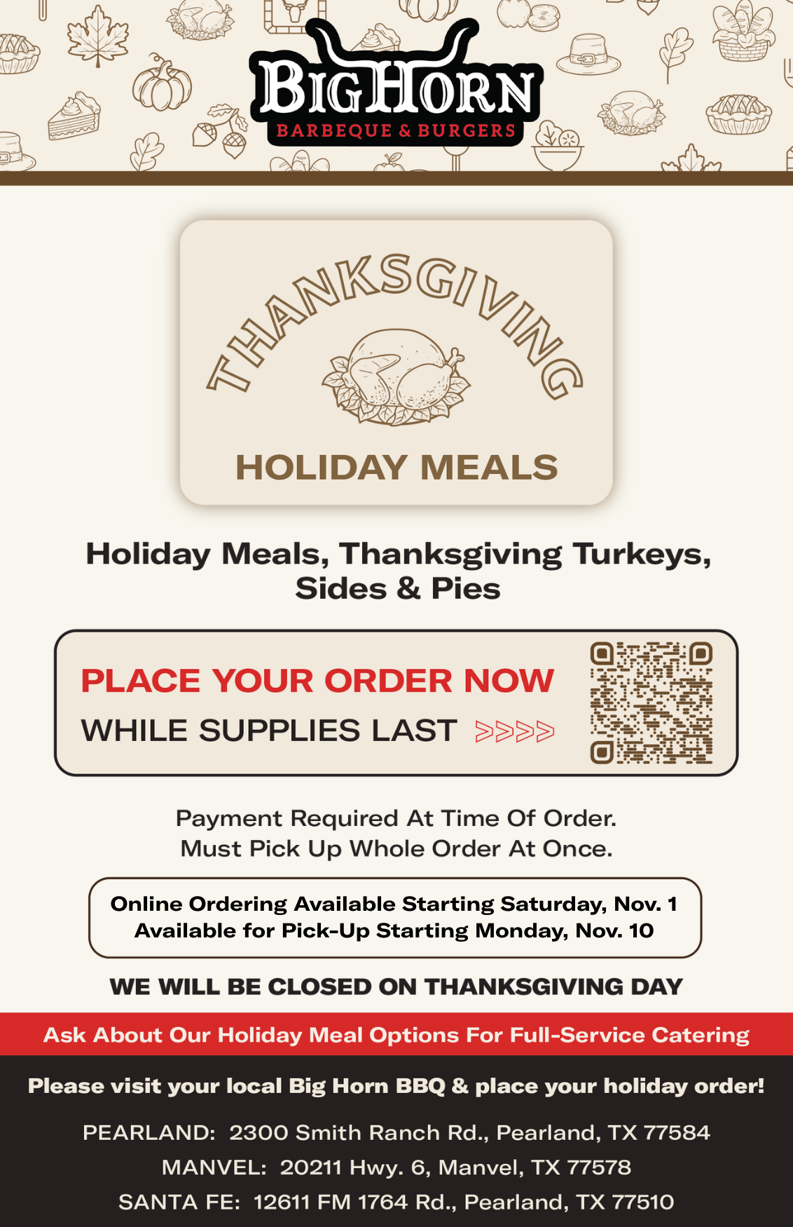 Holiday meals, turkeys, sides, and pies—ready for pickup and full of Texas flavor. 🕓 Order today while supplies last!